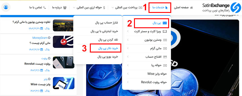 ۲. پس از تکمیل ثبت نام، از منوی بالای صفحه، خدمات ما ← پیپال ← خرید دلار پی پال را انتخاب نمایید.