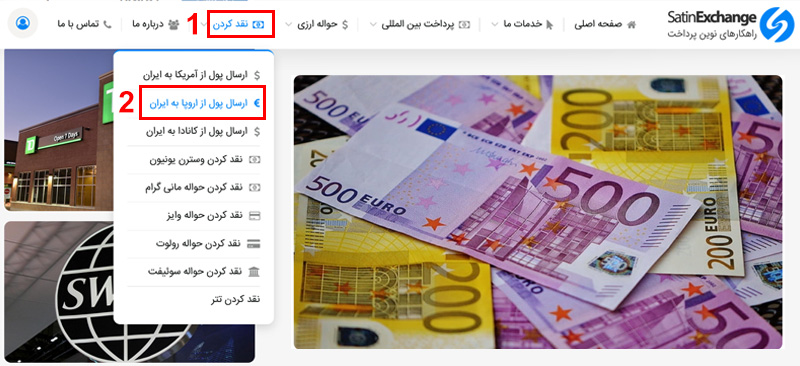 ۲. انتخاب سرویس مناسب: پس از ورود به حساب کاربری، از منوی بالای صفحه، نقد کردن و ارسال پول از اروپا به ایران را انتخاب کنید.